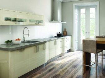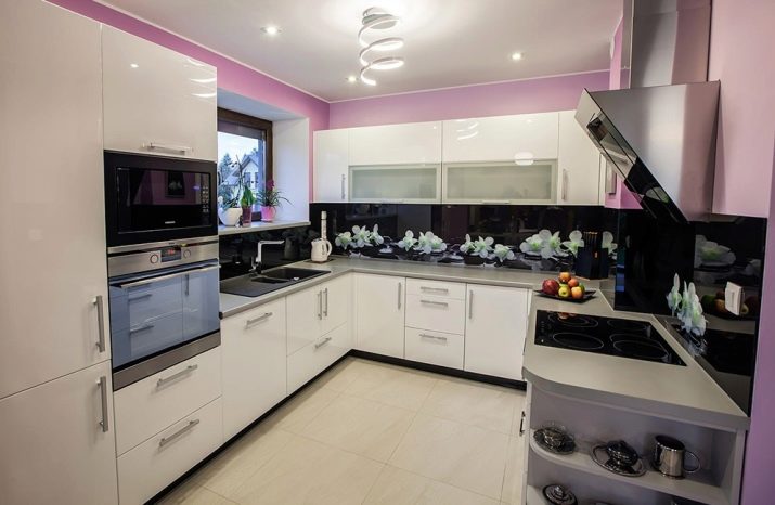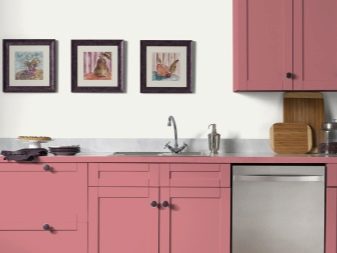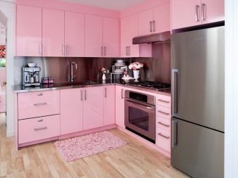 Ружичаста боја је на десетине варијација, од блиставих до аристократских. Пригушена ружичаста, ружичаста са млеком - ове су опције врло релевантне, воле их подједнако и мушкарци и жене. Металик ће бити добар помоћник за ружичасто у таквој унутрашњости. Одлично је ако је цоунтертоп у складу са фрижидером (мада је то опциони услов).