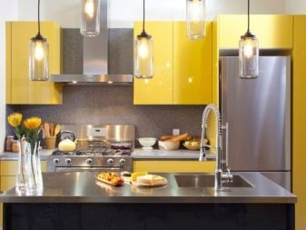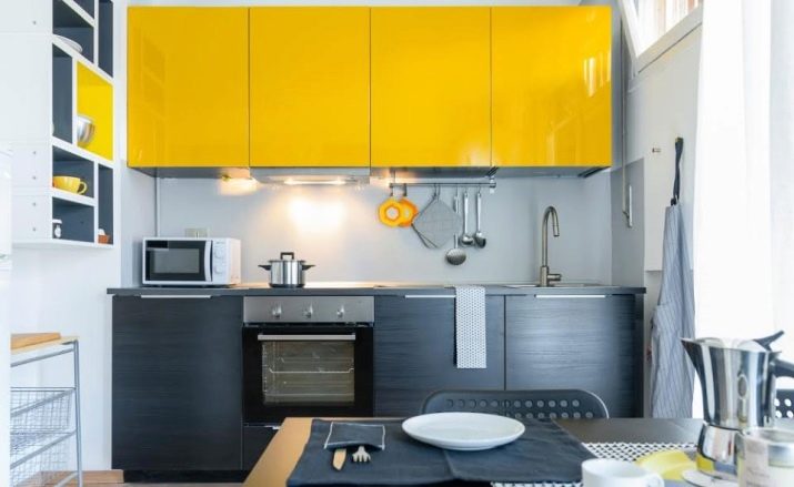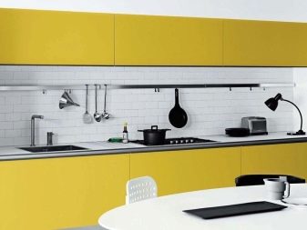За оне који се боје успаваног расположења које може подесити боју, вриједно је разриједити бескомпромисно свијетлим. На пример, жута. Ово је, узгред, веома добро решење за малу кухињу. ЕАко желите да одвратите пажњу са скромних снимака кухиње, смирите се, али додајте мало веселе боје као одговарајућу зачин.