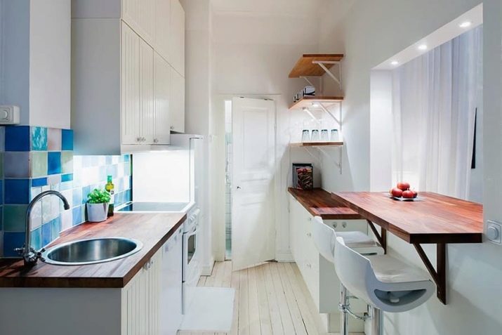 Такође се дешава да они чине уски део угаоне кухиње. Наравно, не онај у коме се налазе кућански апарати, већ са обичним кутијама. Овде можете да створите висинску разлику, посебно ако је ова страна укључена у зонирање просторије.