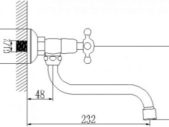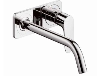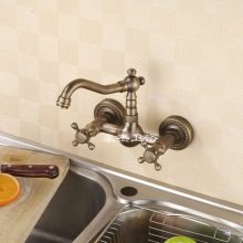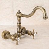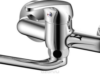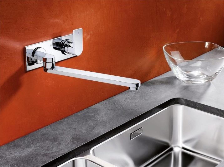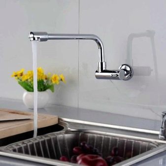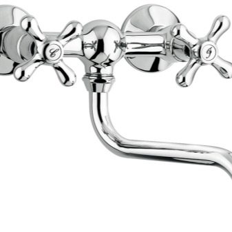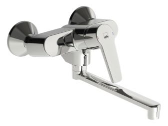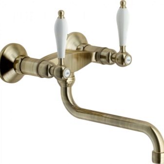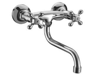 Ова водоводна опрема опремљена је специјалним цревима, помоћу којих је уређај повезан на цевовод топле и хладне воде, украсне пераче, заптивке и заптивке. Током уградње, спојни елементи и шавови се не крију у зиду. Овде ће вам требати декоративни елементи, уз помоћ којих миксеру дају естетскији изглед. Зидну славину за судопер одликује дугачак, висок и стрмо закривљен отвор.