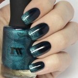 - По жељи, узорак можете надопунити шљокицама или рхинестонес. Да бисмо то учинили, посадимо их на премаз без премаза након што нанесемо цртеж на шаблон. Након наношења горњег премаза, узорак можете освежити користећи технику росишта. Да би то учинили, често користе тачкице и уобичајени транспарентни алат највишег нивоа. Дотсом стављају округле и овалне капљице на лишће и латице руже. Маникир је волуминозан, ефикаснији и природнији.