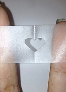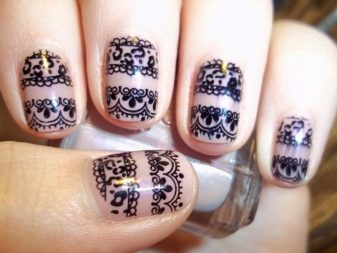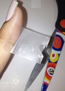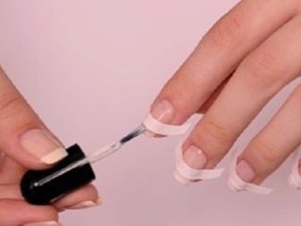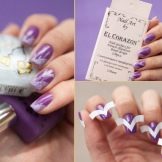 Цртеж се преноси на траку или траку за маскирање оловком од филца. За најситније детаље користите оловку. Изрезати узорке на готовим линијама неће бити тешко. Затим користимо такве домаће шаблоне, попут обичних продавница. Код наношења на нокат посебно ће бити потребно изглађивати шаблон тако да у додиру са површином нема бора или празнина.