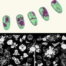 Предлошци се најчешће користе за стварање слика у биљним предметима. Такви узорци изгледају не мање импресивно од ручно осликаних. А дизајн маникуре је створен довољно брзо. Узорак с цвијећем или монограмом најпопуларнији је код већине жена. Нудимо вам да направите цртеж у стилу "сцреен сцреен" корак по корак.