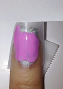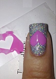 - Затим залепите изабрани шаблон на нокатну плочу. Пажљиво га изравнајте на површини. На слободну прорезу шаблона наносимо изабрану другу боју контрастног лака.