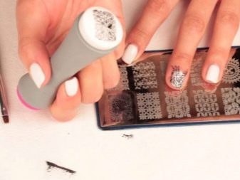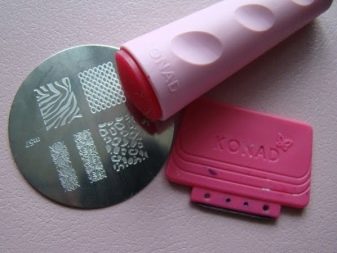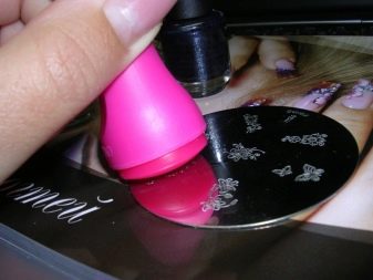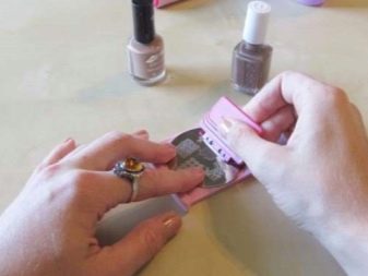 - Да бисте пренијели узорак користећи технику утискивања, изаберите жељени украс на плочи. На њега наносимо специјално средство за утискивање. Обичан гел или лак неће радити јер нема жељена својства и конзистенцију. Боја се обично наноси четком. Уклоните вишак боје са металног печата. Затим направите отисак на гуменом жигу, чврсто га притискајући на тањир.