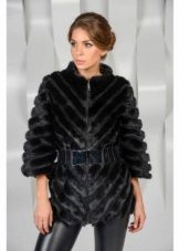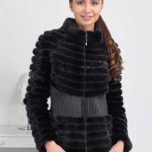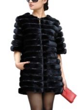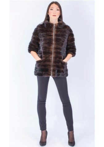 Скраћени крзнени капут са хоризонталним комадима крзна један је од најскромнијих модела. Лагано раширени руб и рукав до лакта додају елеганцију изгледу.