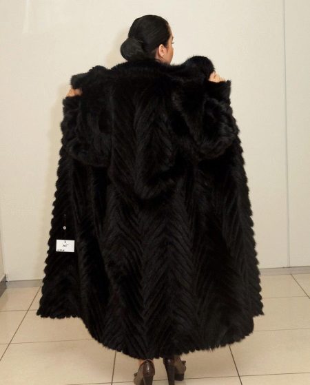 - крзнени капут са силуетом у облику слова А, са појасом у струку, равним рукавима, луксузном капуљачом или огрлицом одмотањем;