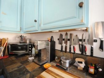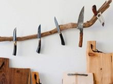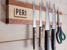 - Дужина држача покупити у зависности од броја ножева. Имајте на уму да ножеви не смеју да се постављају један поред другог. Биће естетскије и хигијенски ако између њих постоји мала удаљеност. У неким случајевима ће вам можда требати комбинација неколико трака.Овај дизајн изгледа професионално и омогућава вам постављање великог броја уређаја.