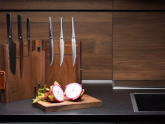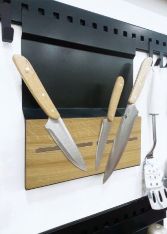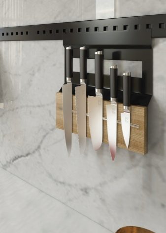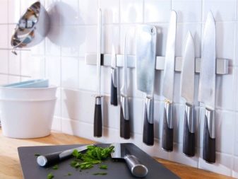 - Уштеда простора. Држач заузима мало простора, постајући готово један комад с вертикалном површином. Ножеви постављени на магнет такође су компактно распоређени у низу.