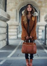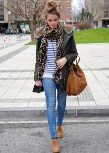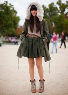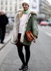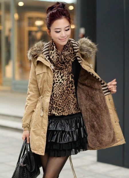 Женствена парка свијетле боје с крзненом огрлицом и оригиналним украсом савршено ће употпунити одјећу прекрасне црне сукње с наборима и модерне блузе од леопарда. Невероватно елегантан и модеран комплет.