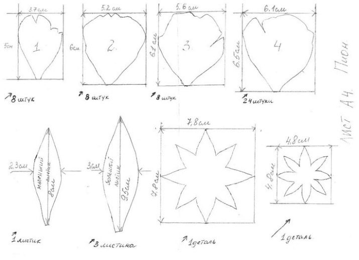 Ако имате залихе свих потребних материјала и уређаја, можете наставити припремна фаза производња фоамуранских божура. Пре свега, морате припремити детаље предложак будућих заната. Без праве скице и шеме при руци, нећете успети направити квалитетан букет, посебно ако је реч о мајстору почетнику.