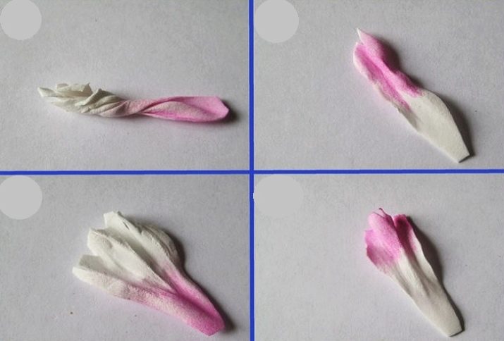 - Дајте латицама божура прави облик. Латице ове биљке су благо конкавне. Лако је створити потребне прогибе и наборе на фоамирану. Сваку латицу увијте у штапић, извуците и отворите. Ивице ће бити благо наборане, таласасте.
