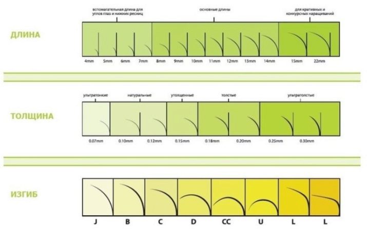 Закривљени цилија СС се разликују у дебљини и дужини. Препоручује се да ове параметре (они су дефинисани у милиметрима) дефинише мастер. У понуди је избор цилија дуга од 5 до 18 мм.