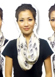 - Шал се такође може везати у облику цхокера. Да бисте то учинили, требате чврсто да омотате прибор око врата и исецкајте слободне крајеве тако да не буду видљиви. Ако су чворови везани у чвор и постављени са стране, испадаће да је то француски чвор. Ова метода плетења шал је релевантна не само у романтичним сликама.