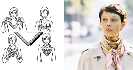 - Ако свилена шал има трокутасти облик, онда се може поставити тако да је угао на грудима. Остали крајеви се такође могу пренијети напријед.