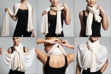 - Ова метода ће захтевати дуг шал. Мора бити бачен преко врата, подељен на неједнаке делове. Дуг крај шала требате омотати око врата и чвора. Једноставно, брзо, оригинално.