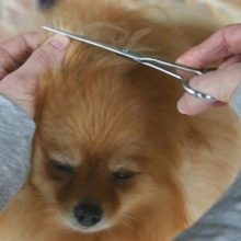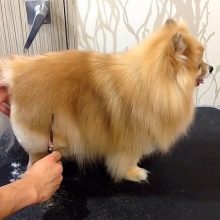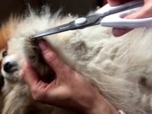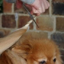 - Назад. Будући да већина пасмина шпица обожава стегнути реп до ануса, треба га подићи и поставити на леђа животиње. Након тога, лагано чешљајте косу дуж линије косе у различитим смјеровима. Овде би требало да одрежете само највеће длаке, које заиста могу да ометају љубимца. Прије поступка препоручује се кућном љубимцу одредити границе леђа, дуж којих ћете се кретати током шишања. Потребно је осигурати да се дужина косе у близини ануса поклапа са будућом дужином остатка косе. За фризуру у овом подручју боље је одабрати шкаре с тупим или заобљеним зубима.