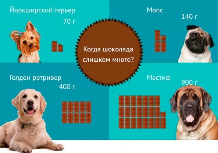 На пример, да би се особа отровала, концентрација теобромина треба да буде 1000 мг / кг живе тежине, а за пса смртоносна доза - у просеку 300 мг / кг. Млечна чоколада садржи од 150 до 200 мг ове материје.