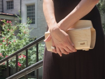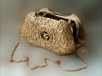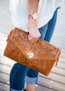 Träkopplingen har en rektangulär form och en stel ram. Det är för dem som materialets naturlighet är viktigt för. Det kan användas för vardagliga kläder, men glöm inte att en sådan koppling inte är den mest praktiska. En sådan handväska ser bäst ut med jeanskläder.