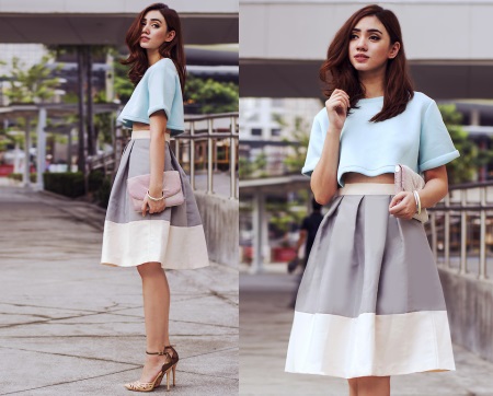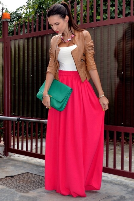 En turkos koppling är lämplig för en sommar kjol i golvet i valfri färg. Det ser bäst ut med en kjol med samma rika färg och en vit topp på toppen. Dekoration kan antingen vara helt frånvarande eller bör anpassas till tonen.