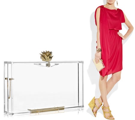 En transparent koppling är perfekt för en röd aftonklänning och guld sandaler. Det är bättre om du ser en gyllene koppling inuti den. Då kan du bära guldfärgade smycken på handleden.