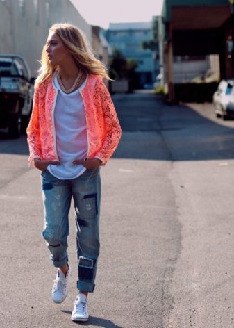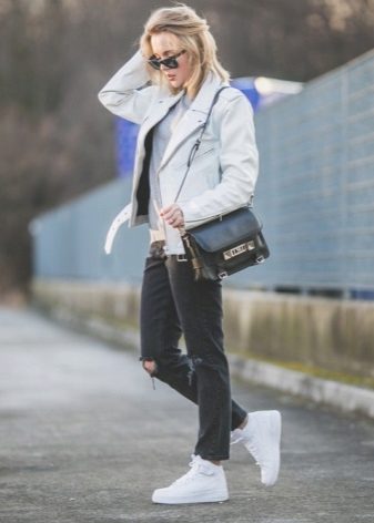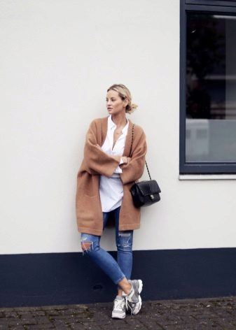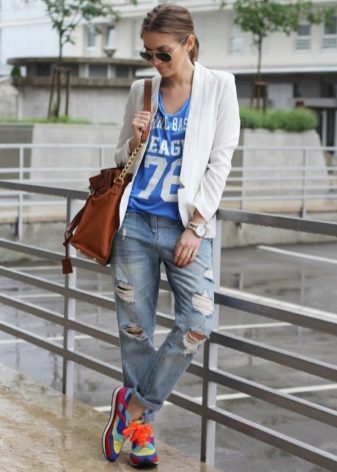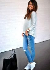 - Fashionabla ljusblå rippade jeans - pojkvänner i kombination med en vit kofta i en långsträckt modell kommer att gå bra med mocka färg sneakers.