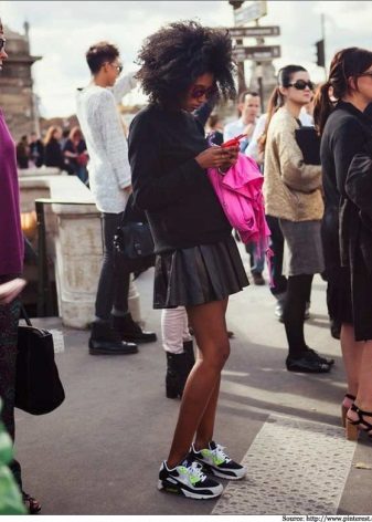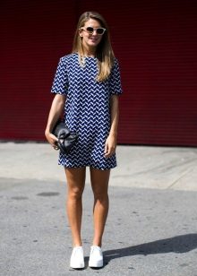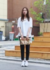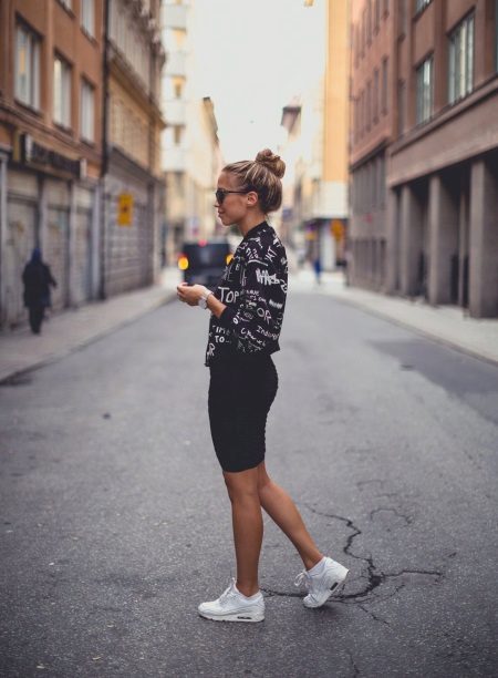 - Vita sneakers passar perfekt med en smal kjol - en svart penna och en svart chiffongblus med ett tryck i form av vita inskriptioner.