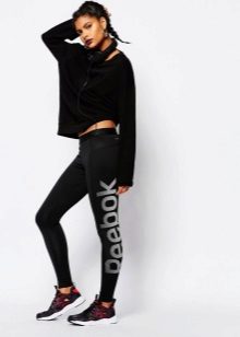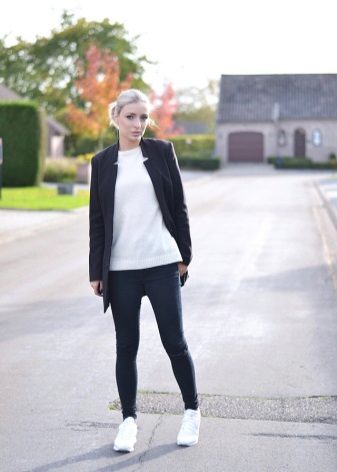 - Svarta leggings tillverkade av materialet "under huden", en lätt blus och en kashmirrock i en skugga av grädde brulee kompletteras perfekt med en snygg väska och vita sneakers från en klassisk modell.