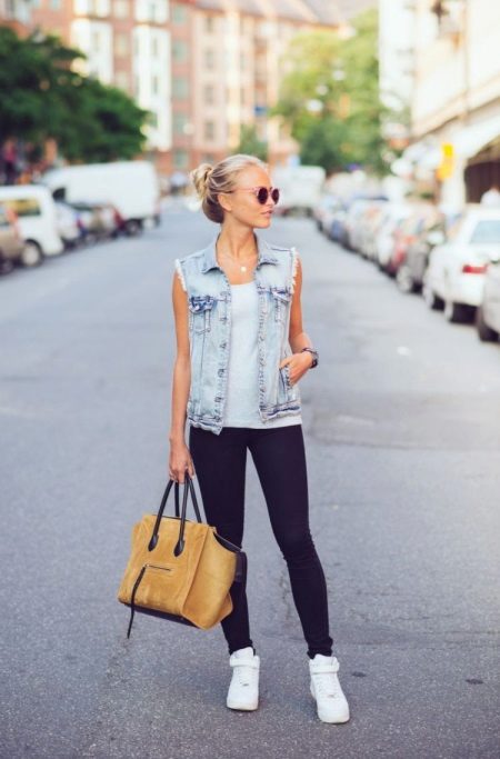 - Blå smala byxor, en vit tröja och en elegant denimväst i en ljusblå nyans kommer att se jättebra ut med en stor sandfärgad mockapåse och vita sneakers.