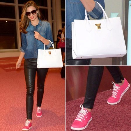 - Vita smala byxor och en tank top, i kombination med en blå jacka och en svart väska, kompletteras perfekt av ljusa rosa sneakers.