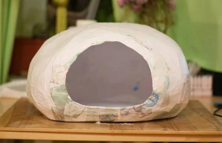 Efter fullständig torkning kan ballongen sprängas och tas bort från farkosten. Skär ett stort inlopp. Du kan också klippa ytterligare dörrar och fönster. Ett litet hål kan göras i den övre delen för att hänga huset från burets tak. Du kan fylla ett sådant originalhus med skrynkliga remsor av tyg eller papper för att göra boet mer bekvämt. På detta sätt du kan göra alla hus i olika former med olika bollar.