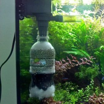 เครื่องกรองชีวภาพสามารถผลิตได้อย่างอิสระอย่างอิสระ และเราจะพิจารณาการติดตั้งของรุ่นทำในบ้านที่เรียกว่า "ขวด" ขนาดของมันขึ้นอยู่กับปริมาณของตู้ปลา