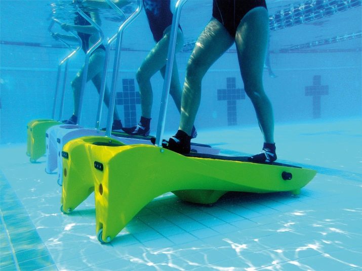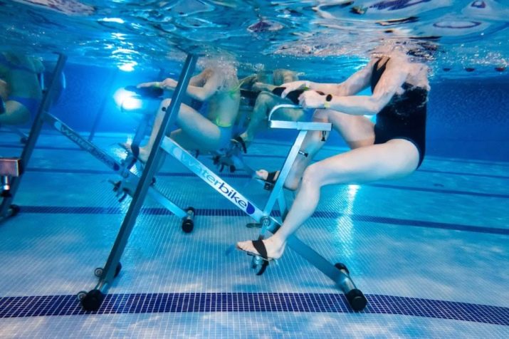 - จักรยานน้ำ นี่คือจักรยานออกกำลังกายสแตนเลสธรรมดาที่ตั้งอยู่ในสระน้ำเท่านั้น ไม่มีข้อห้ามสำหรับการเรียนในชั้นเรียนเลย มันเหมาะสำหรับคนที่กลัวว่ายน้ำเนื่องจากเด็กฝึกหัดบนอุปกรณ์นี้กระโจนเข้าที่หน้าอก ประโยชน์ที่ได้รับนั้นมีมากมายมหาศาลการฝึกอบรมอย่างสม่ำเสมอทำให้การทำงานของกล้ามเนื้อหัวใจลดความเสี่ยงของโรคหลอดเลือดหัวใจและด้วยความแข็งแกร่งของระบบหลอดเลือดดำช่วยลดความเสี่ยงของโรคเส้นเลือดขอด นอกจากนี้ยังสามารถจัดการกับคนที่ทุกข์ทรมานจากโรคกระดูกพรุน