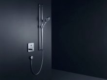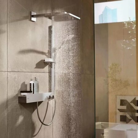 Hansgrohe Raindance Select S 27648400 - ชุดฝักบัวสุดเก๋ เส้นสายที่รัดกุมและกระชับนั้นเข้ากันได้อย่างลงตัวกับการออกแบบที่เรียบง่าย ชั้นวางของพวยท่อดูดีกับพื้นหลังของผนังสีเทาอ่อน แม้แต่กระจกในองค์ประกอบนี้ก็มีที่ที่ถูกต้อง ด้วยอุบัติการณ์อันน่าตื่นเต้นของแสงน้ำเจ็ทดูเหมือนน่าสนใจกว่าปกติ