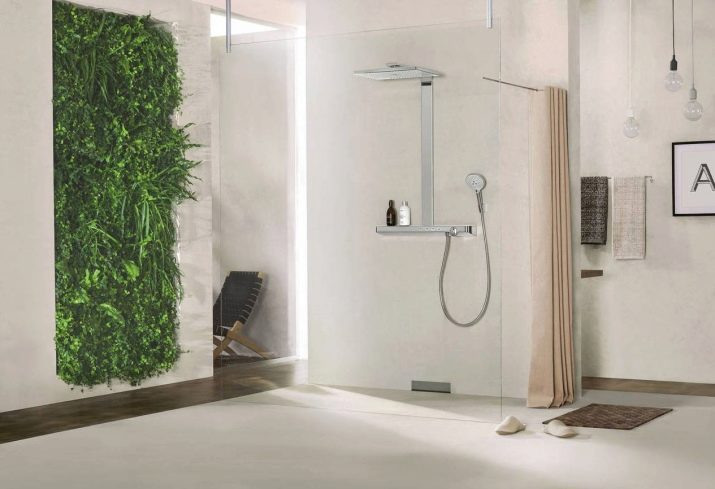 ภาพนี้แสดงระบบฝักบัวอาบน้ำ Hansgrohe Rainmaker เลือก 460 พร้อมชั้นวาง กับพื้นหลังของกำแพงไฟการออกแบบดูดีมาก การตกแต่งด้วยหญ้าสีเขียวเพิ่มความน่าดึงดูด การใช้สีอ่อนอย่างเข้มงวดในการตกแต่งภายในดูค่อนข้างเป็นธรรม องค์ประกอบการตกแต่งหลายอย่างถูกนำมาใช้อย่างชำนาญ