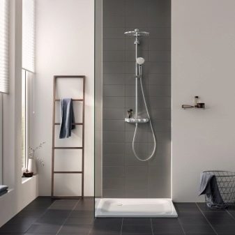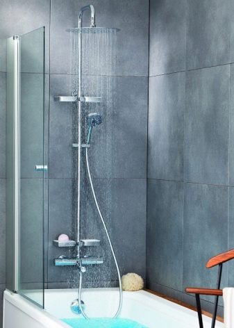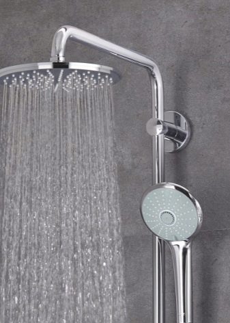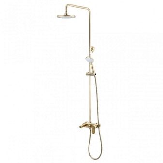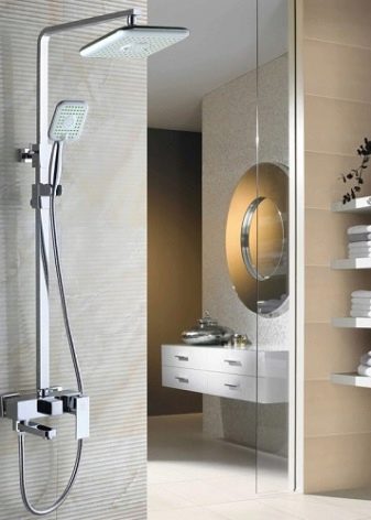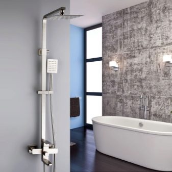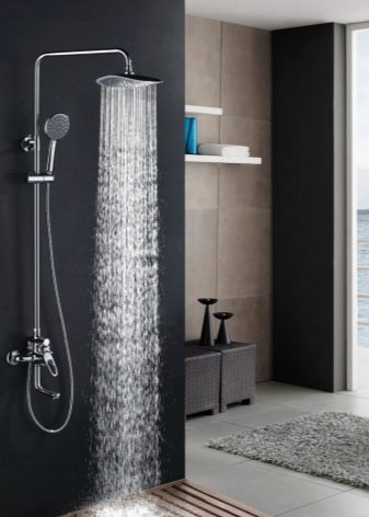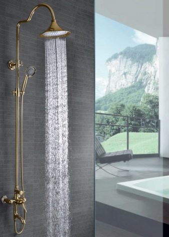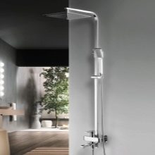 ชุดหูฟังดังกล่าวเป็นระบบขนาดกะทัดรัดที่ไม่ใช้พื้นที่มากและถูกออกแบบมาเพื่อรับน้ำ การออกแบบที่เรียบง่ายเช่นนี้ช่วยให้คุณจัดระเบียบมุมอาบน้ำได้เกือบทุกส่วนของห้องน้ำ มีเพียงคนเดียวที่จะดูแลท่อระบายน้ำบนพื้น (มันควรจะอยู่ในมุมที่เล็กน้อยเพื่อให้น้ำเก็บได้อย่างรวดเร็วไปยังรูท่อระบายน้ำ) และปิดพื้นที่ที่เกิดขึ้นด้วยม่าน คอลัมน์ฝักบัวพร้อมก๊อกน้ำยังสามารถแก้ไขได้เหนืออ่างอาบน้ำ