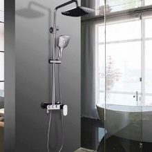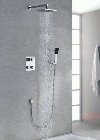 - ยืนด้วยเทอร์โม มันมีฝักบัวพร้อมขาตั้งและมิกเซอร์แข็งเช่นเดียวกับเทอร์โม งานหลังคือการควบคุมอุณหภูมิของน้ำขจัดความเสี่ยงของการเผาไหม้หรืออุณหภูมิ