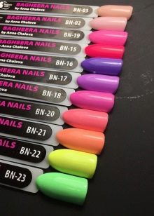 โดยปกติแล้วสีขององค์ประกอบเหล่านี้จะสว่างกว่าและลึกกว่าสีของตัวเลือกแบบดั้งเดิม นอกจากนี้เจลทำให้สามารถอ้างถึงเอฟเฟกต์ดั้งเดิมทุกประเภทเกี่ยวกับเล็บของผู้หญิงต้องขอบคุณภาพลักษณ์ที่น่าสนใจและมีชีวิตชีวาทำให้เจลขัดเงาสมัยใหม่ได้รับความนิยมอย่างมาก