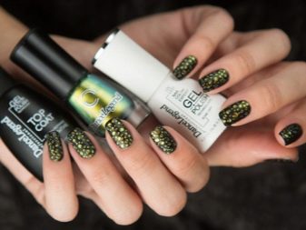 - กิ้งก่า ความแปลกใหม่เช่นนี้จะดึงดูดแฟน ๆ ของน้ำมันชักเงา เนื้อหาของ "กิ้งก่า" มีอนุภาคพิเศษที่ตอบสนองต่อการเปลี่ยนแปลงของอุณหภูมิและแสง เจลขัดบางชนิดเสริมด้วยชิปหอยมุกที่สวยงาม