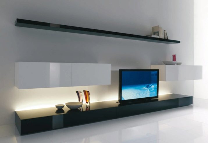 ตู้แขวนสีขาวที่มีแสงไฟสีฟ้า - โซลูชั่นที่สมบูรณ์แบบสำหรับห้องนั่งเล่นที่ทันสมัยในสีดำและสีขาว