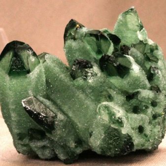 สีของหินถูกกำหนดให้เป็นเฉดสีเขียว มันอาจเป็นสีเขียวอ่อนสีเขียวมรกตสีเขียวเข้มมะนาวไม่มีสี บ่อยครั้งที่หินสูญเสียสีภายใต้อิทธิพลของแสงแดด ความแข็งคือ 7 จาก 10 ความหนาแน่นคือ 2, 65 g / cm³แร่ค่อนข้างบอบบาง ไม่มีการทำงานร่วมกันเป็นรอยร้าวแตกหักเป็น syngony ตรีโกณมิติ