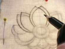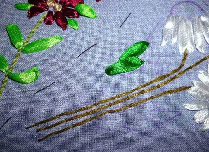 หลังจากจัดวางภาพด้วยดินสอนุ่มหรือชอล์กวาดเส้นหยักที่วาดลำต้นไปยังดอกไม้แล้วปักด้วยด้ายสีเขียวหนาแน่น - เป็นการดีที่สุดที่จะใช้หลายเธรดในคราวเดียว