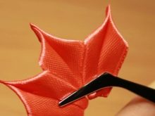 เพื่อบิดกลีบดอกไม้โดยใช้เทคโนโลยีง่ายๆ สำหรับงานฝีมือคุณต้องใช้ริบบิ้นผ้าซาตินที่มีความกว้าง 5 ซม. และใช้กรรไกรตัดเป็นรูปสี่เหลี่ยมขนาด 5x5 ซม. ตามลำดับพวกเขาเผาสถานที่ที่ถูกตัดด้วยเทียนและงอชิ้นงานที่เกิดขึ้นในแนวทแยงมุม 3 ครั้ง