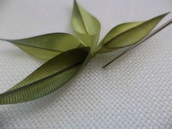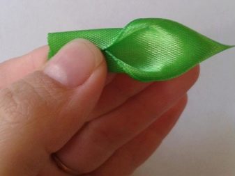 ใบไม้สามารถสร้างได้ในอีกทางหนึ่ง - ในกรณีนี้สี่เหลี่ยมคางหมูถูกตัดออกจากเทปสีเขียวเพื่อให้ด้านข้างของมันคือ 4 และ 1 ซม. แล้วงอเป็นครึ่งหนึ่งโดยกดสองมุมเข้าหากัน ในกรณีนี้ด้านหน้าของวัสดุควรอยู่ข้างใน มุมนั้นถูกเกรียมและสิ่งสำคัญคือการยึดขอบเกรียมด้วยนิ้วของคุณด้วยการเคลื่อนไหวที่แข็งแกร่ง