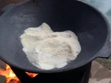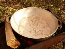 - หม้อขนาดใหญ่จะถูกส่งไปกองไฟตามด้วยการเทเกลือลงไป 2,000 กรัม กระบวนการเผาควรจะดำเนินต่อไปจนกว่าเกลือจะเปลี่ยนเป็นสีเทา