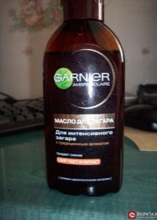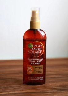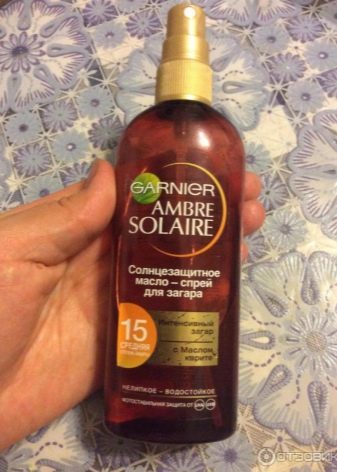 - น้ำมัน Garnier Ambre Solaire พร้อมค่า SPF15 ค่อนข้างเป็นเครื่องมือในงบประมาณ ในฐานะที่เป็นส่วนผสมเพิ่มเติมเชียบัตเตอร์ (เชียบัตเตอร์) มีอยู่อ่อนนุ่มฟื้นฟูการป้องกันการปรากฏตัวของการระคายเคืองวิตามินอีให้การฟื้นฟูที่ดีขึ้นและการกำจัดของการปอกเปลือกแม้กระทั่งจากการเผาไหม้ น้ำมันติดตั้งเครื่องจ่ายสเปรย์ กลิ่นหอมเป็นแบบตะวันออก