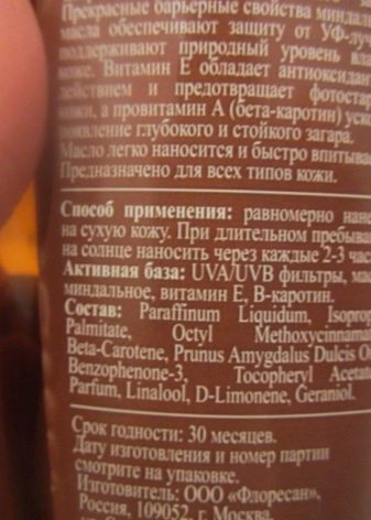 แม้จะมีชื่อของผลิตภัณฑ์น้ำมันพื้นฐานไม่ใช่ส่วนประกอบหลักในองค์ประกอบของผลิตภัณฑ์นี้ พวกเขาไม่เพียงพอที่จะปกป้องผิวจากผลอันตรายของรังสีอัลตราไวโอเลต แต่แน่นอนว่าน้ำมันหรือส่วนผสมของน้ำมันจะเป็นส่วนหนึ่งของผลิตภัณฑ์ - เนื่องจากมีความมั่นคงของน้ำมัน แต่พวกเขาจะอยู่ตรงกลางหรือแม้กระทั่งในตอนท้ายของรายการองค์ประกอบ
