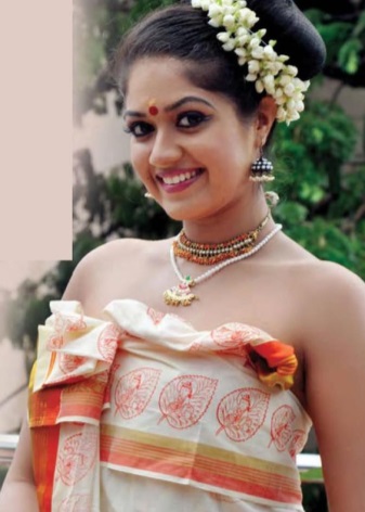 - ส่วนล่างเรียกว่า mekhela นี่คือส่วนที่ค่อนข้างกว้างของผ้าซึ่งพับเก็บไว้สร้างหลายเท่าทางด้านขวาและห่อหุ้มด้วยเข็มขัด แม้จะมีริบบิ้นบนผ้า แต่ก็ไม่ได้ผูก