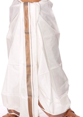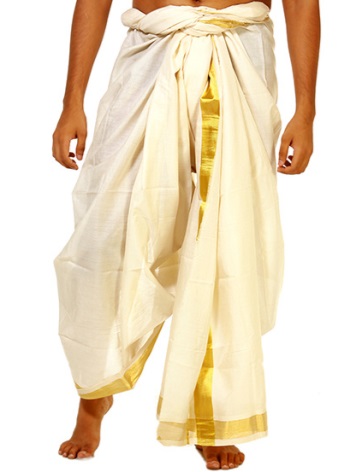 - Dhoti เป็นผ้าฝ้ายที่มีความยาวมากถึง 6 เมตรซึ่งส่วนใหญ่มักเป็นสีขาว ผ้านี้พันรอบสะโพกเพื่อให้มีการส่งผ่านปลายระหว่างขาและผูกด้วยปมเข็มขัด การออกแบบดังกล่าวติดอยู่กับสายพานซึ่งหมายถึงสถานะของเจ้าของ ภาพจิตรกรรมฝาผนังและเครื่องประดับบนสายพานเป็นส่วนสำคัญของอินเดียที่ร่ำรวย