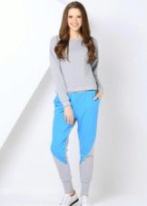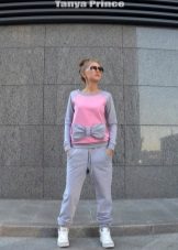 ภาพที่สามเหมาะสำหรับผู้หญิงที่เข้มงวดซึ่งไม่เห็นความจำเป็นในการตกแต่งตัวเองด้วยอุปกรณ์เสริมเพิ่มเติมและงานพิมพ์ขนาดใหญ่ สิ่งที่สำคัญที่สุดสำหรับพวกเขาคือการทำงานของเสื้อผ้า ชุดพูดน้อยประกอบด้วยกางเกงกีฬาถักสบายนั่งอยู่บนร่างและเสื้อที่มีซิปกับกระโปรงมีการตกแต่งบนแขนเสื้อที่มีแถบ ตัวเลือกที่ดีสำหรับการฝึกซ้อมอย่างหนักหรือโยคะ